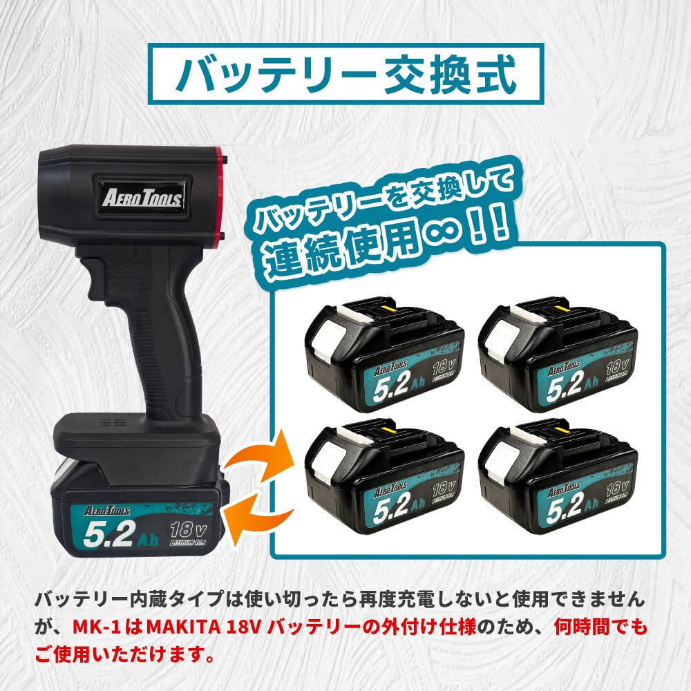 本製品は18Vのマキタバッテリーで駆動します。純正のバッテリーはもちろんのこと、各種互換バッテリーでも使うことができるので、MAKITAの掃除機や工具などをお使いの方ならすぐにご使用いただけます。